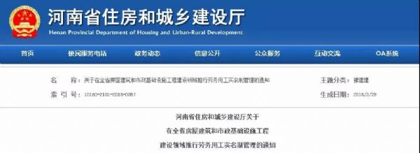 2018年3月,河南省住建廳印發(fā)《在全省房屋建筑和市政基礎(chǔ)設(shè)施工程建設(shè)領(lǐng)域推行勞務(wù)用工實名制管理的通知》(豫建建〔2018〕16號)。