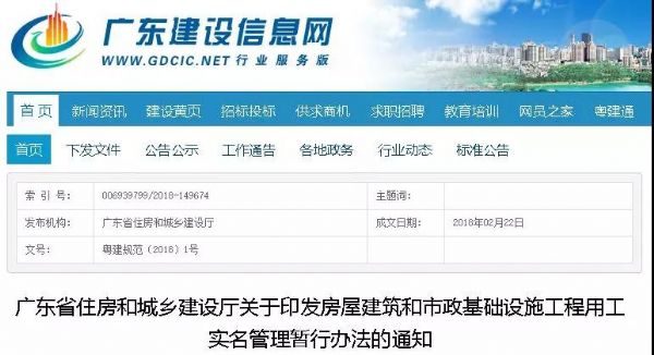 2018年2月,廣東省住建廳印發(fā)《關(guān)于印發(fā)房屋建筑和市政基礎(chǔ)設(shè)施工程用工實名管理暫行辦法的通知》(粵建規(guī)范〔2018〕1號)。