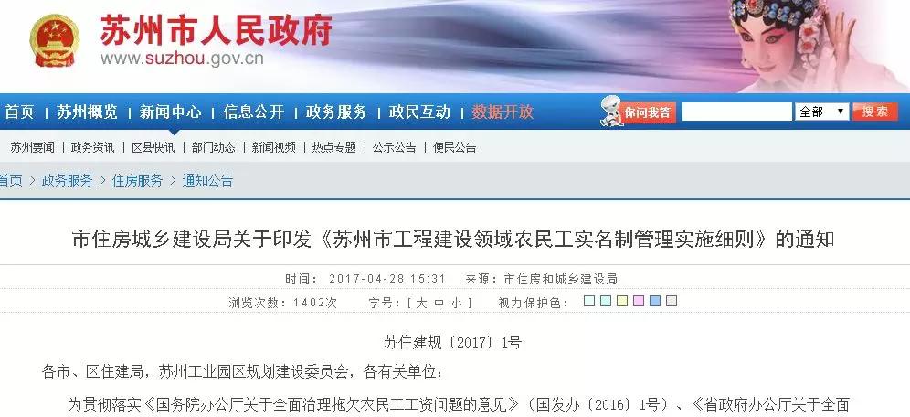 2017年4月28日,蘇州市印發(fā)《工程建設(shè)領(lǐng)域農(nóng)民工實名制管理實施細(xì)則》。