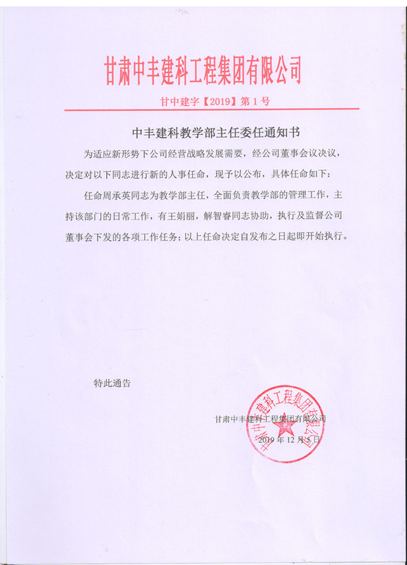 中豐建科甘肅教學部主任委任通知書