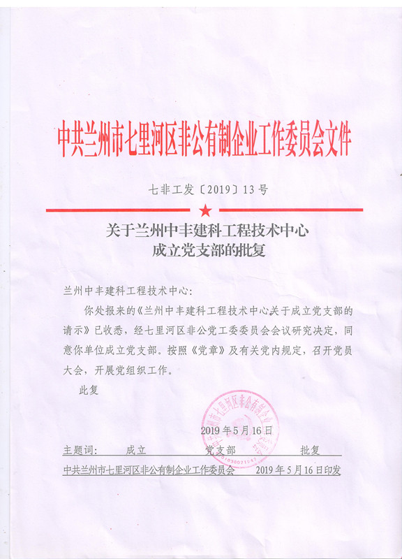 關(guān)于蘭州中豐建科工程技術(shù)中心成立黨支部通知