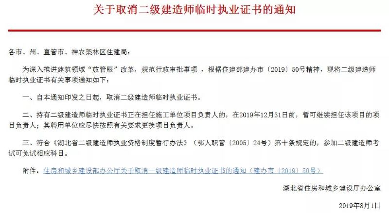 8月1日,湖北省住建廳發(fā)布《關(guān)于取消二級建造師臨時執(zhí)業(yè)證書的通知》,率先明確二建臨時證書自即日起取消。12月31日前,暫可繼續(xù)擔任該項目的項目負責人。