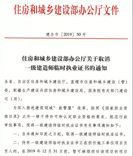 近日,住建部辦公廳發(fā)布了《關(guān)于取消一級建造師臨時執(zhí)業(yè)證書的通知》,要求各省市住建部門做好取消二級建造師臨時執(zhí)業(yè)證書有關(guān)工作。