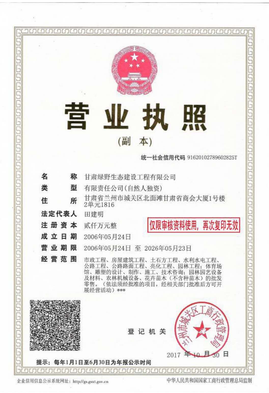 甘肅綠野生態(tài)建設(shè)工程有限公司營業(yè)執(zhí)照