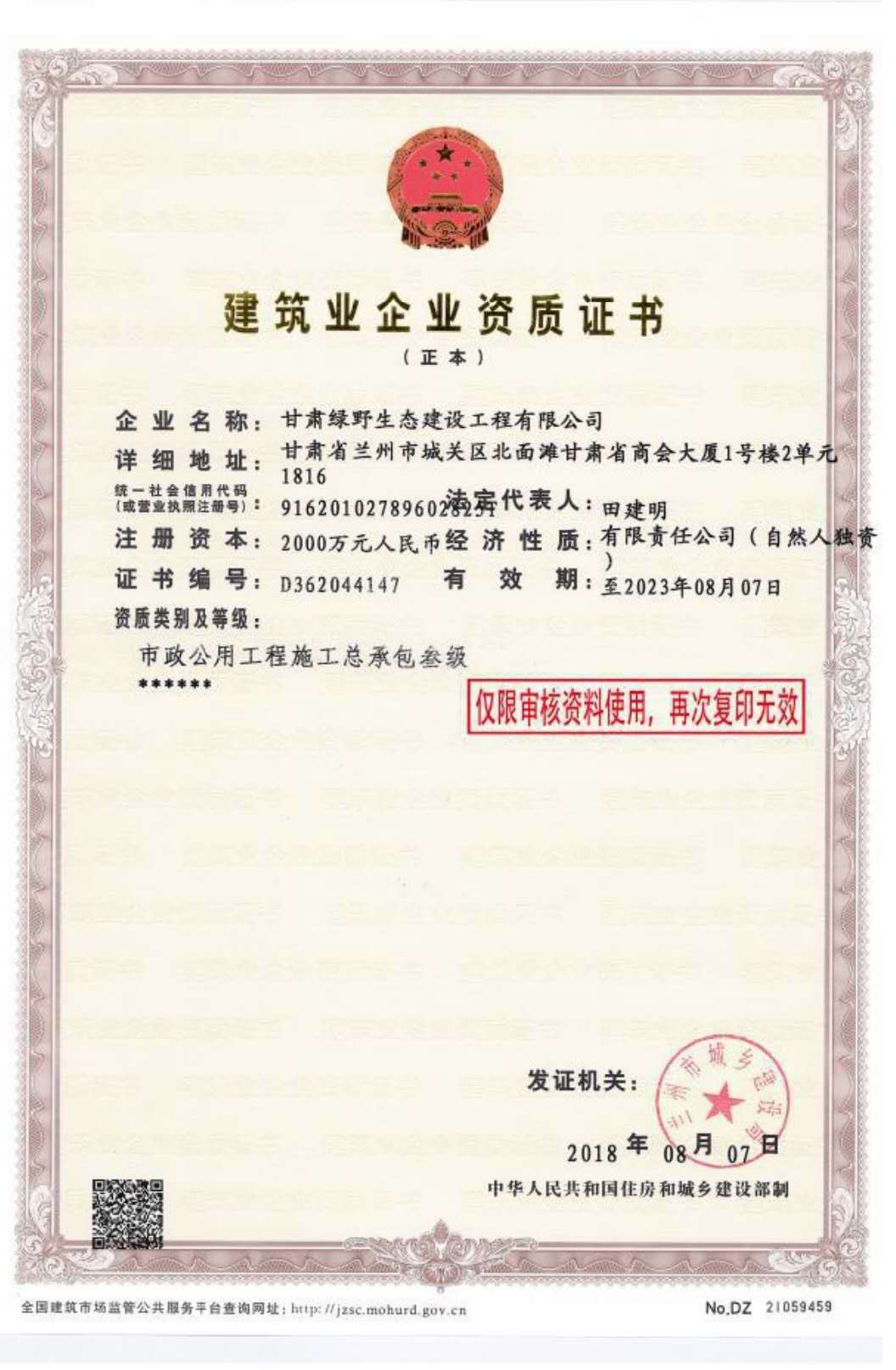 甘肅綠野生態(tài)建設(shè)工程有限公司資質(zhì)證書