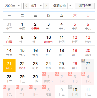 1、放假時間:2020年10月1日至10月8日(星期四—星期四)