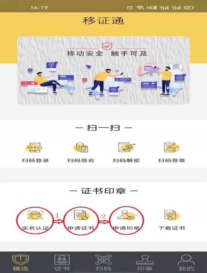 第一步:下載手機移證通,用手機號碼驗證登錄,實名認證—申請證書---印章申請。如圖所示: