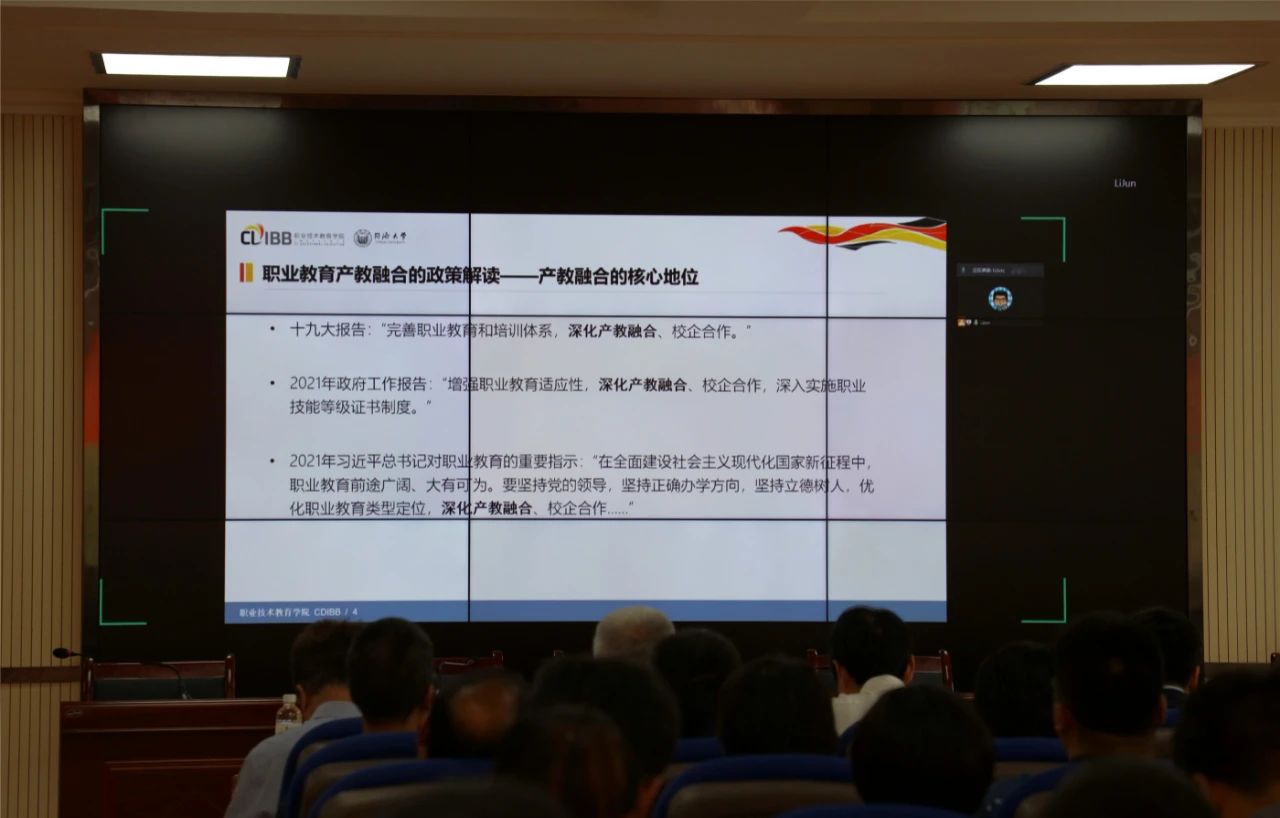 首先,同濟大學博士李俊以錄播的形式線上分享了題為《職業(yè)教育產教融合的政策解讀與國際比較分析》的報告,報告從職業(yè)教育產教融合的政策解讀、產教融合的核心地位和產教融合的側重點,以及職業(yè)教育產教融合的國際比較分析,行業(yè)企業(yè)參與職業(yè)教育的形式程度,學校適應產業(yè)界需求的形式,并以德國雙元化職業(yè)教育產教職合為案例,詳細解讀了職業(yè)教育產教融合的現狀和發(fā)展趨勢?偨Y了職業(yè)教育產教融合的啟示,合理借鑒國外的經驗,充分意識國外產教融合的基礎條件,促進本地實踐。