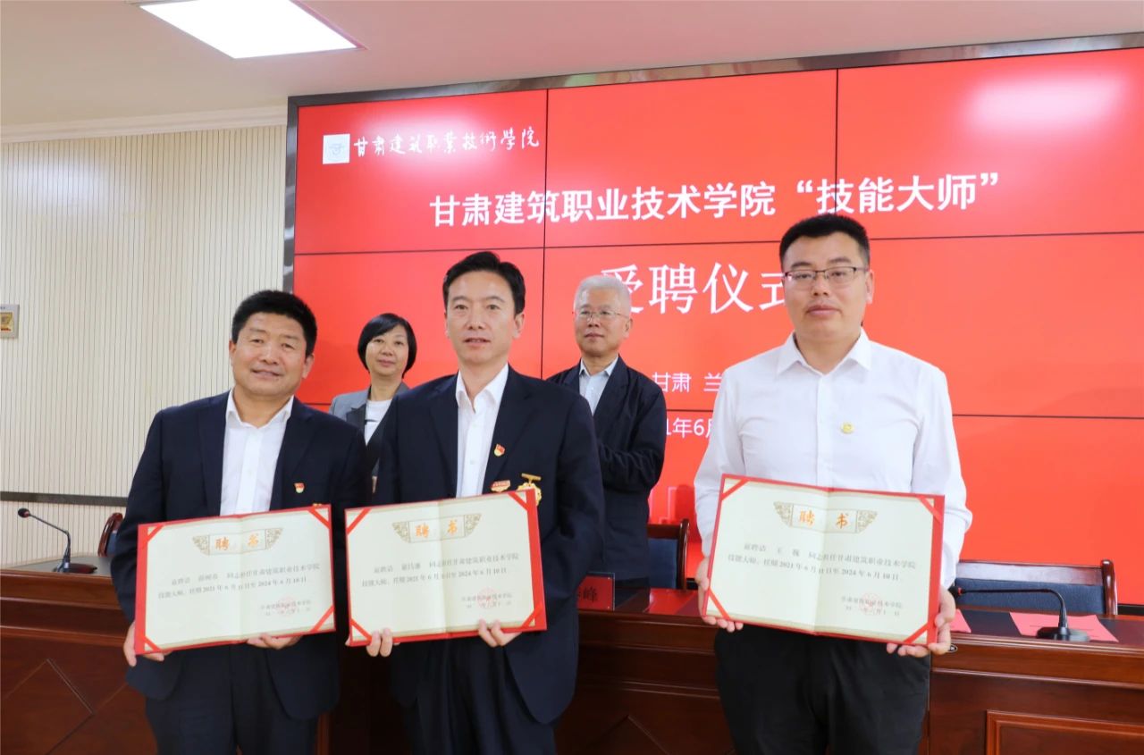 隨后舉行了甘肅省建筑職教集團、甘肅建筑職業(yè)技術學院“技能大師”受聘儀式,特聘甘肅第六建設集團股份有限公司智能科科長薛樹春、甘肅第六建設集團股份有限公司安全科謝昌盛、北京東方雨虹防水技術股份有限公司雨虹學院副院長王巍為我院“技能大師”。