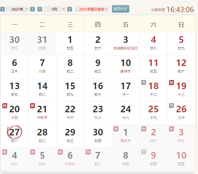 注:9月26日(星期日)、10月9日(星期六)正常上班