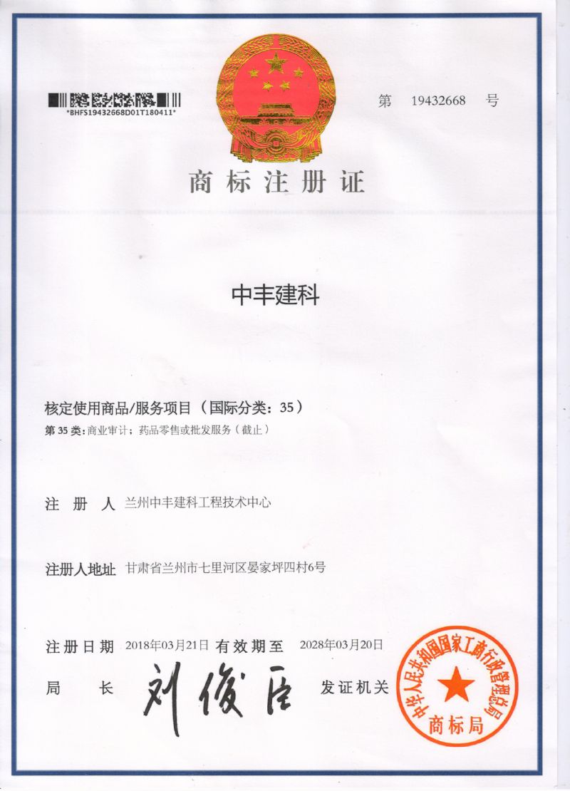 蘭州中豐建科工程技術(shù)中心35類商標證書