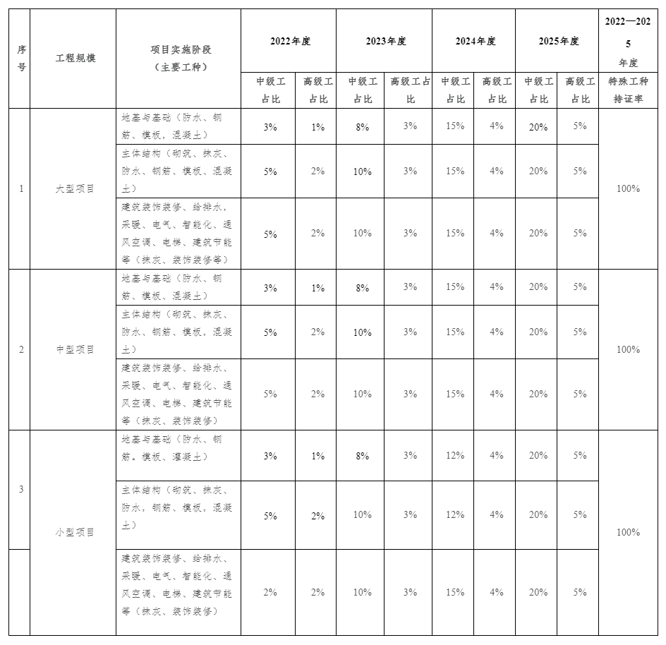 2021年5月,住建部發(fā)布《關(guān)于開展施工現(xiàn)場技能工人配備標(biāo)準(zhǔn)制定工作的通知》,根據(jù)通知要求: 新建、改建、擴建房屋建筑與市政基礎(chǔ)設(shè)施工程建設(shè)項目,均應(yīng)制定相應(yīng)的施工現(xiàn)場技能工人配備標(biāo)準(zhǔn)。 2025年,力爭實現(xiàn)在建項目施工現(xiàn)場中級工占技能工人比例達到20%、高級工及以上等級技能工人占技能工人比例達到5%。 2035年,力爭實現(xiàn)在建項目施工現(xiàn)場中級工占技能工人比例達到30%、高級工及以上等級技能工人占技能工人比例達到10%。 技能工人包括一般技術(shù)工人和建筑施工特種作業(yè)人員: 一般技術(shù)工人等級分為初級工、中級工、高級工、技師、高級技師;工種類別包括砌筑工、鋼筋工、模板工、混凝土工等,具體設(shè)置參照《住房城鄉(xiāng)建設(shè)部辦公廳關(guān)于印發(fā)住房城鄉(xiāng)建設(shè)行業(yè)職業(yè)工種目錄的通知》(建辦人〔2017〕76號)執(zhí)行。各地可結(jié)合行業(yè)發(fā)展產(chǎn)生的新工種適時進行調(diào)整。 建筑施工特種作業(yè)人員包括建筑電工、建筑架子工、建筑起重信號司索工、建筑起重機械司機、建筑起重機械安裝拆卸工、高處作業(yè)吊籃安裝拆卸工和經(jīng)省級以上人民政府住房和城鄉(xiāng)建設(shè)主管部門認定的其他特種作業(yè)人員等。 13省發(fā)文跟進! 目前為止,已有13省市區(qū)發(fā)文跟進,部分地區(qū)明確: 施工現(xiàn)場所有技能工人必須100%持證上崗; 技術(shù)工人不得同時在兩個及兩個以上的建設(shè)工程項目主體結(jié)構(gòu)施工期間任職,不得在同一項目的建設(shè)單位或相關(guān)中介機構(gòu)中兼職。 6月27日,山東省住建廳發(fā)布《關(guān)于印發(fā)山東省房屋建筑與市政公用工程建設(shè)項目施工現(xiàn)場技能工人配備指南(試行)的通知》。 各項目技能工人配備中級、高級及以上等級技術(shù)工人不宜少于1人。 施工現(xiàn)場不同等級技能工人數(shù)量可以代換,一名中級工可以代換兩名初級工,一名高級工可以代換兩名中級工。 ▲上下滑動查看全部 閱讀全文:山東印發(fā)《房屋建筑與市政公用工程建設(shè)項目施工現(xiàn)場技能工人配備指南(試行)》 6月15日,黑龍江省住建廳發(fā)布關(guān)于印發(fā)《黑龍江省房屋建筑和市政基礎(chǔ)設(shè)施工程項目施工現(xiàn)場技能工人配備標(biāo)準(zhǔn)(試行)》的通知。 原文鏈接: http://zfcxjst.hlj.gov.cn/news_info/1/30/2022-00468.html 6月13日,四川省住建廳發(fā)布《房屋建筑工程與市政基礎(chǔ)設(shè)施工程施工現(xiàn)場技能工人配備標(biāo)準(zhǔn)》,自10月1日起施行。 原文鏈接: http://jst.sc.gov.cn/scjst/c101428/2022/6/13/169e5b10aa844880931112c955b470a9.shtml 6月8日,江西省住建廳發(fā)布關(guān)于《江西省建筑工程施工現(xiàn)場從業(yè)人員配備管理辦法(征求意見稿)》公開征求意見的通知。其中包含對技能人員配備的要求: 一、施工現(xiàn)場所有技能工人必須100%持證上崗,由建筑工程質(zhì)量安全監(jiān)督管理部門負責(zé)監(jiān)督管理。 二、到2025年,施工現(xiàn)場技能工人中級工占比不低于20%,高級工及以上的人員占比不得低于5%。 三、施工現(xiàn)場技能工人數(shù)量計算式(試行): 1.房屋建筑工程工人數(shù)量計算公式: N=S×A÷T 式中:N:工人數(shù)量(人) S: 建筑面積(㎡) T:合同工期(天) A: 每平方米平均用工數(shù)(工日);A=1.8-2.2(建筑面積≤1萬平方米),1.6-1.8(1萬平方米<建筑面積≤5萬平方米),1.4-1.6(建筑面積>5萬平方米)。 2.市政基礎(chǔ)設(shè)施工程工人數(shù)量計算公式: N=S×A÷T 式中:N:工人數(shù)量(人); S: 工程總造價(萬元); T:合同工期(天); A: 每平方米平均用工數(shù)(工日),取值按:特大型橋梁及隧道和施工條件復(fù)雜的大型橋梁及隧道工程取5-7.5;其中大中型橋梁及隧道工程取6.25-9.38,;其他橋涵及隧道工程,結(jié)構(gòu)工程取7.5-11.5;機電安裝取6.25-9.38;道路、廣場、園林綠化、綜合管網(wǎng)及其他附屬工程取9.38-12.5。 原文鏈接: http://zjt.jiangxi.gov.cn/art/2022/6/8/art_40724_3987332.html 6月9日,福建省住建廳發(fā)布關(guān)于印發(fā)《福建省房屋建筑與市政基礎(chǔ)設(shè)施工程建設(shè)項目施工現(xiàn)場技能工人配備導(dǎo)則(試行)》的通知。 一般技能工人應(yīng)經(jīng)培訓(xùn)合格取得崗位證書;建筑施工特種 作業(yè)人員應(yīng)經(jīng)各設(shè)區(qū)市住建主管部門考核合格取得建筑施工特種作業(yè)操作資格證。 施工企業(yè)強化項目建筑工人實名制信息化管理,做好技能工人等級信息錄入、更新等工作,將施工現(xiàn)場技能工人配備情況上傳至福建省勞務(wù)實名制管理平臺。 原文鏈接: http://zjt.fujian.gov.cn/xxgk/zfxxgkzl/xxgkml/dfxfgzfgzhgfxwj/jzsc/202206/t20220609_5927601.htm 5月23日,天津市住房城鄉(xiāng)建設(shè)委發(fā)布《天津市房屋建筑和市政基礎(chǔ)設(shè)施工程施工現(xiàn)場從業(yè)人員配備標(biāo)準(zhǔn)》,自2022年9月1日起實施。 原文鏈接: http://zfcxjs.tj.gov.cn/xxgk_70/tzgg/202206/t20220615_5905903.html 5月19日,浙江省住建廳發(fā)布關(guān)于印發(fā)《浙江省房屋建筑市政工程施工現(xiàn)場技能工人配備導(dǎo)則》的通知。 原文鏈接: http://jst.zj.gov.cn/art/2022/5/19/art_1229159346_58929577.html 5月17日,湖南省住建