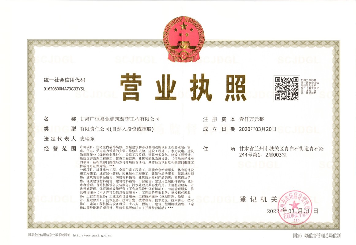 甘肅廣恒嘉業(yè)建筑裝飾工程有限公司 營業(yè)執(zhí)照