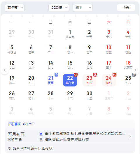 6月22日至6月24日放假調(diào)休,共3天。6月25日(星期日)正常上班。明天就是端午節(jié)了提前祝您以及您的家人端午安康!