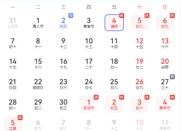 2025年4月4日至6日放假調(diào)休,共3天。4月7日(星期一)上班