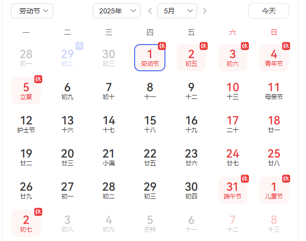 2025年5月1日至5月5日放假調(diào)休,共5天。5月6日(星期一)上班。