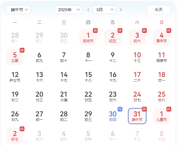 5月31日至6月2日放假調(diào)休,共三天。6月3日(星期二)正常上班。提前預(yù)祝各位同事端午節(jié)安康!