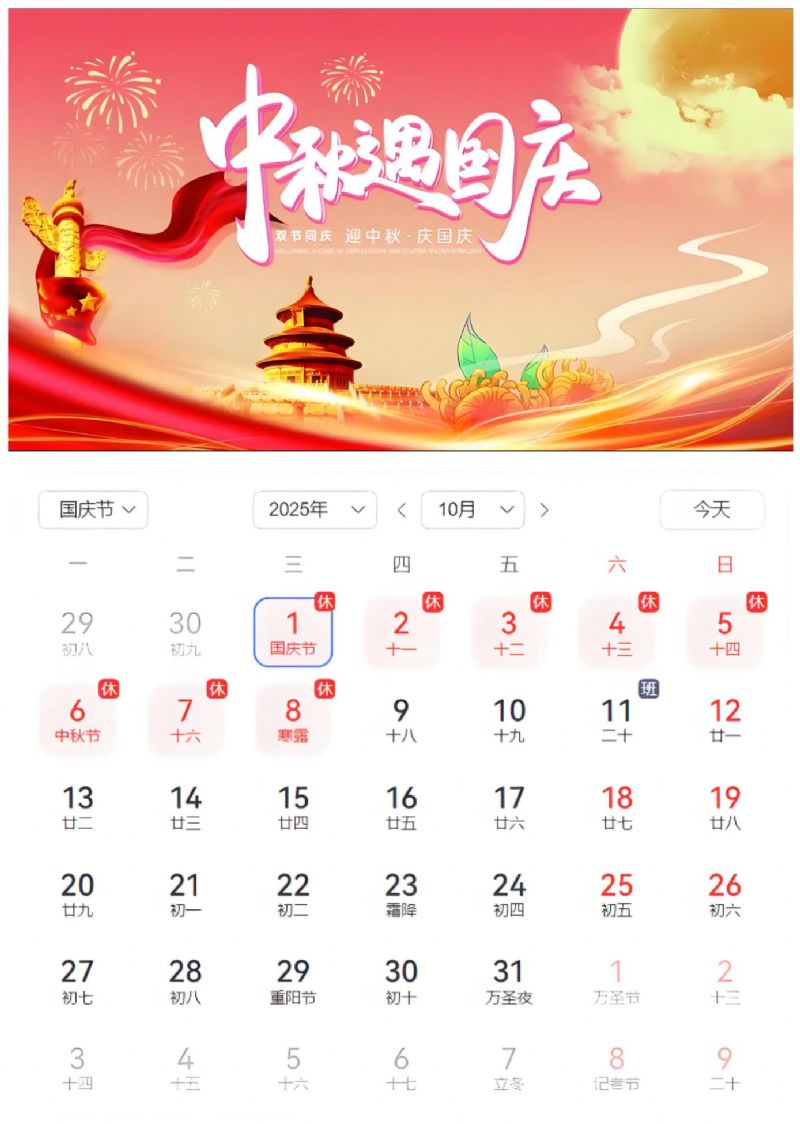 [10月1日-10月8日(放假調(diào)休),共八天。10月9日(星期四)正常上班。恭祝朋友們國慶中秋雙節(jié)快樂、生活喜樂、闔家幸福!